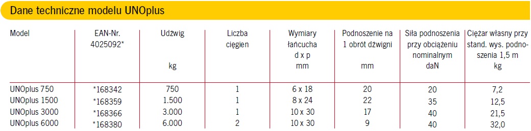 Wszechstronny wciągnik do podnoszenia, ciągnięcia i mocowania ładunków, o zwartej budowie, wykonany ze stali konstrukcyjnej, tworząc korzystny stosunek ceny do efektywności. Mała waga i system wolnego biegu łańcucha powoduje, iż UNO jest poręcznym i uniwersalnym narzędziem.